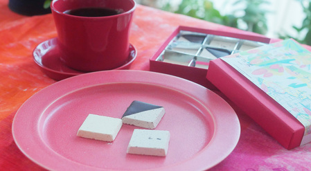 ラズベリーとストロベリーの羊羹と、チョコレートを小豆餡に合わせくるみを食感のアクセントにしたチョコナッツ羊羹を二層にしました。